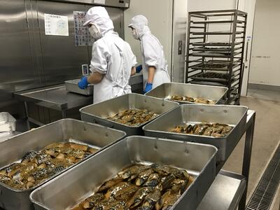 「サバのごまみそだれ」は、焼いたサバに給食室で作ったみそだれをかけました。甘めのみそだれがよく絡んで、ご飯との相性もぴったりです。よくかんで、骨に気をつけて食べましょう。
