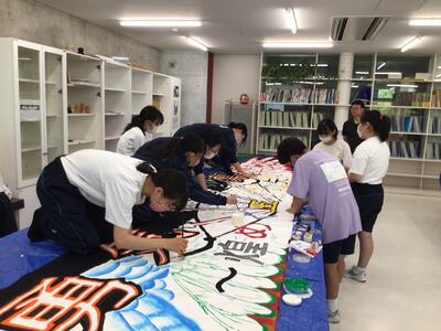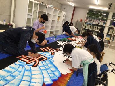 競技や応援の様子を見守るかのような力強い横断幕です。夏季休業中から美術部のみなさんが心を込めて制作してくれました。