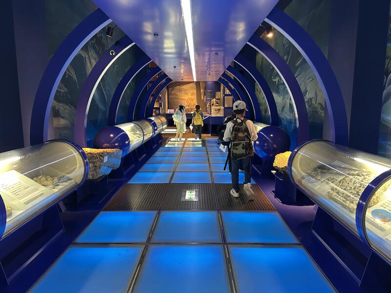 写真は左から水生動物のエリア、宇宙のエリア、企画展示室です。