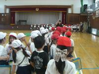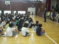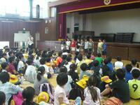 今日は、全校朝会がありました。今月の歌の ♪気球にのってどこまでも♪ の歌声がとても素敵で感動しました。校長先生の話では、読書週間にちなんで、たくさんの本を読んでほしことと、『桃太郎』を先生方の力を借りて英語で紹介し、外国の本、外国語の本なども楽しんでほしいと伝えました。先生方の英語が表情豊かだったので、子ども達は楽しく聞くことができました。