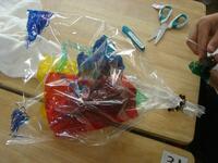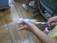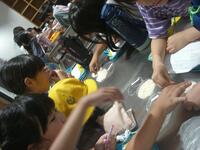 中嶋紺屋では、藍染を体験しました。白い布に輪ゴムをまいて絞り、染料がその部分にしみないようにしました。続いて、布を染料に浸します。ビニール手袋をしていましたが、手まで染まってしまう児童や先生がたくさんいました。