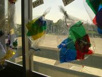 染められた布を空気にさらします。はじめは緑色だった染料が徐々に青くなっていきます。どの作品も個性があってとても素敵です。最後に冷たい水で洗って完成です。