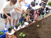 2年生は、生活科で野菜を育てる順bをしていました。1年生と同じ鉢を使っていましたが、土の入れ方は上手ですし、苗も自分たちでどんどん植えていきます。トマトやビーマン、ナスが多数派でした。たくさん実がなるといいですね。