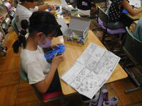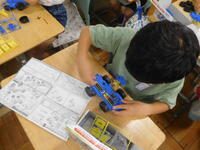 4年4組が、理科で電流のはたらきについて学習をしたいました。電流の大きさとモーターの回る速さの関係について学習した子ども達は、それを生かして電気で動く自動車を作りました。プロペラが逆に回ってしまい、後ろに進んでしまう車には、「電池の向きを反対にするといいよ。」とアドバイスをしていて、学習が定着しているなと感じました。