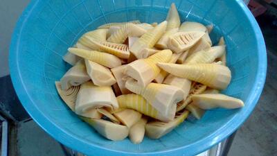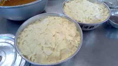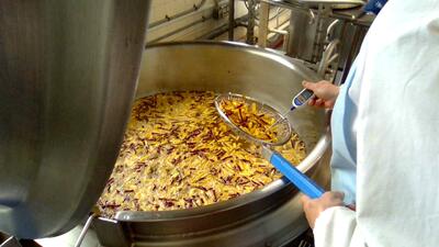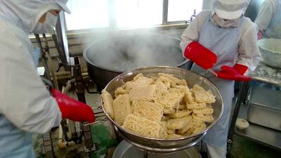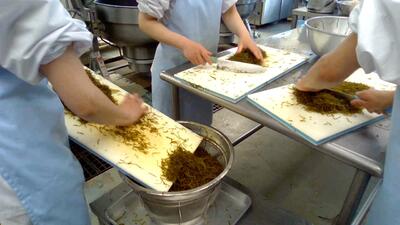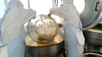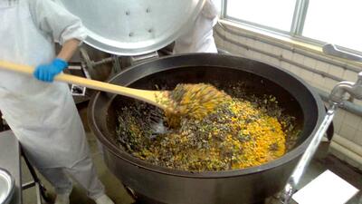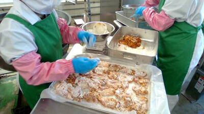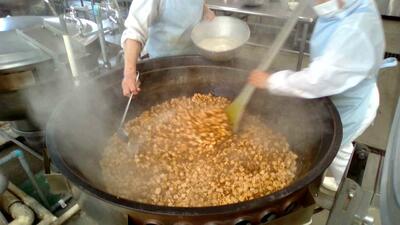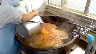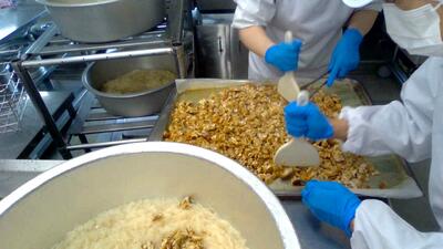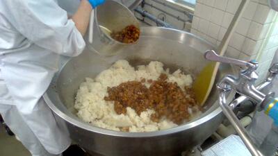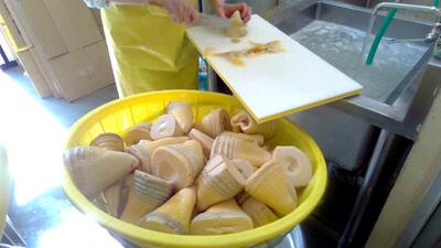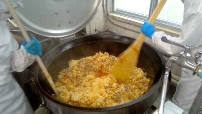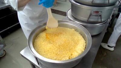 たけのこは、鹿児島産の新物を17kg使用しました。この時期だけしか手に入らない春の味覚です。薄く切り、鶏ひき肉や油揚げと一緒に煮て、ご飯と混ぜました。新物なので香りが強く、美味しく仕上がりました。