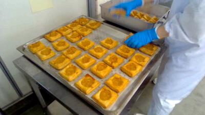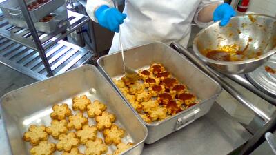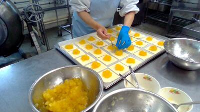 パイナップルケーキは、パイナップルあんが入ったクッキーのようなケーキで、台湾のお土産の定番です。給食ではパイナップルを細かく刻んで煮て、生地に混ぜました。丸めてカップに入れ、オーブンで焼いて出来上がりです。台湾風をイメージして、固めに仕上げました。