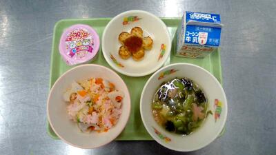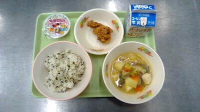 【献立】牛乳 わかめご飯 鶏肉の唐揚げ 春野菜の豚汁 おめでとうデザート