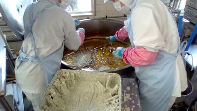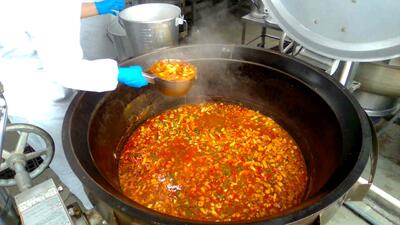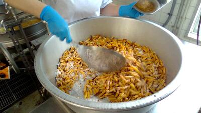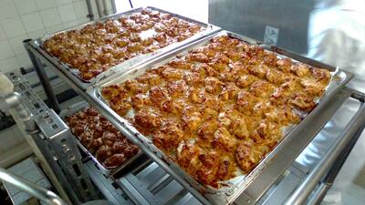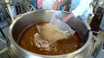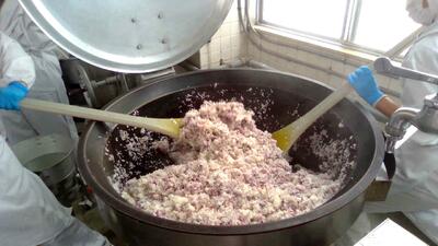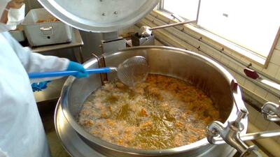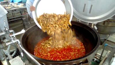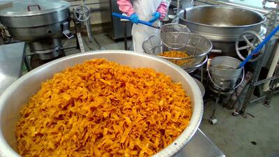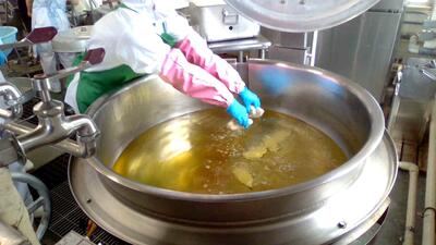 なすは46kg、厚めのいちょう切りにして、さっと素揚げしました。作っておいた肉みそになすを加えて、片栗粉でとろみをつけて出来上がりです。