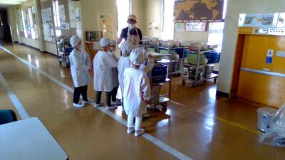 1年生は、給食当番の仕事について説明を受け、4時間目から早めに配膳スタートです。給食当番は、緊張の様子で担任の先生とワゴンプールに移動していました。盛りつけの際は、補助の先生に教えてもらいながら1人1人しっかり分担の仕事をこなしていました。