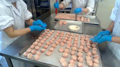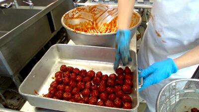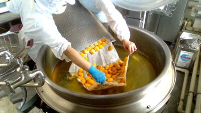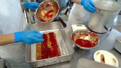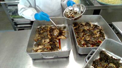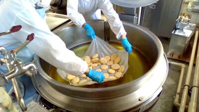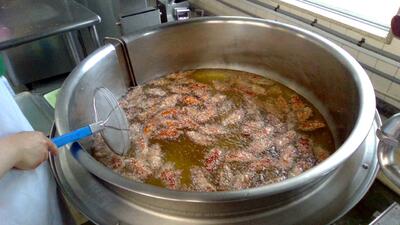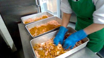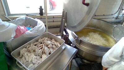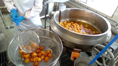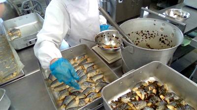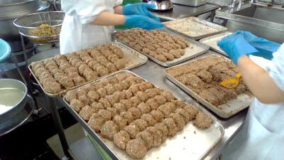 肉団子は、豚ひき肉46kg、木綿豆腐15kg、玉ねぎ10kg、調味料を練って作りました。調理員さんは1180人分×2個で、2360個も丸めて下さいました。揚げる際はクッキングシートごと揚げ油に入れ、表面が固まった頃合いを見て、シートを引き上げます。1回200個ずつ揚げて、2時間半かかりました。初登場の料理でしたが、予定時間通りにスムーズに仕上がりました。表面はカリッと、内側はふんわり仕上がりました。ケチャップと酢などを合わせて作ったあんにからめて、出来上がりです。