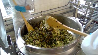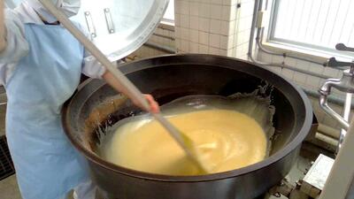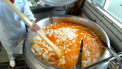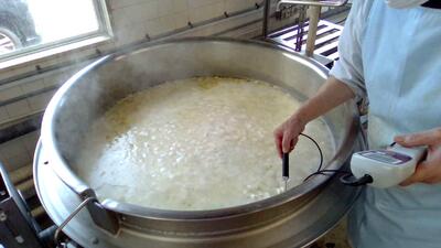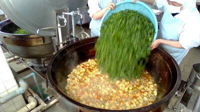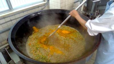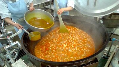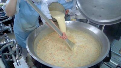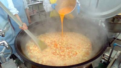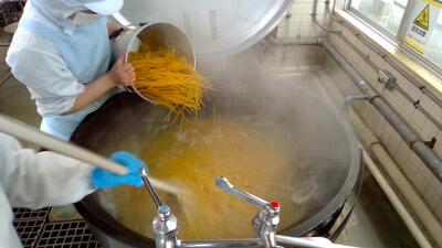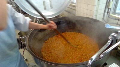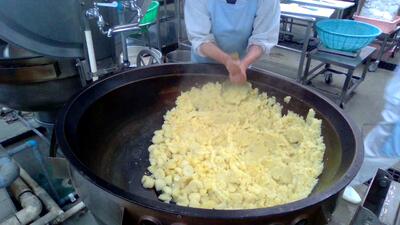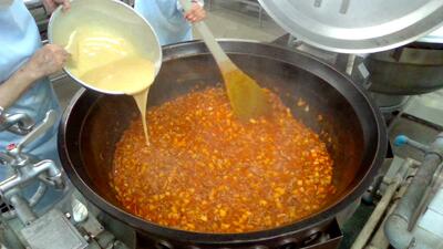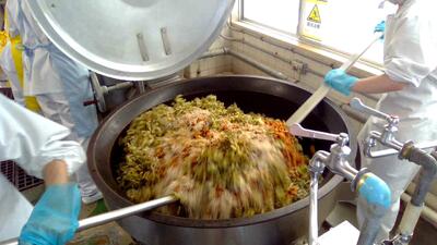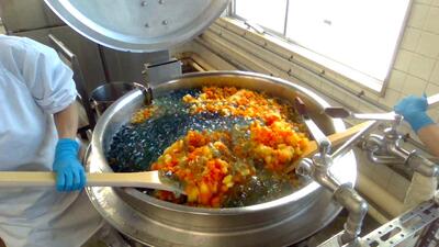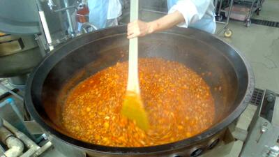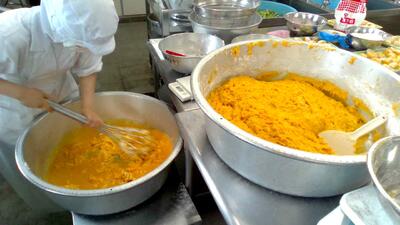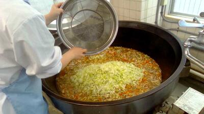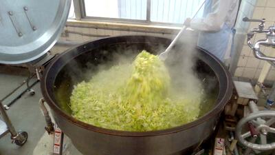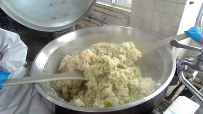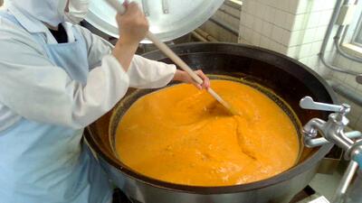 今年度は、給食室に2人の新しい調理員さんを迎えたのですが、今日は2人の調理デビューの日でした。大きなスパテラで釜の中をまんべんなく混ぜるのは、コツが入ります。先輩調理員さんに教わりながら、2人は緊張の面持ちで作業していました。