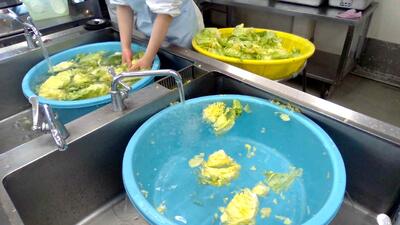 春キャベツは、特有の淡い色合いや葉の薄さで、春を感じさせられます。この時期は小さな虫も多いので、調理員さんは外側の葉をむいてから1回洗い、切り込みを入れてから3回、計4回入念に洗って虫がいないか確かめていました。