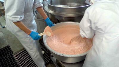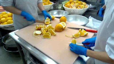 ゼリー和えには、サイダー味のゼリーを混ぜました。水色で涼しげな見た目で、調理員さんは「初夏を感じますね」と言いながら混ぜていました。今日も美味しくできました。