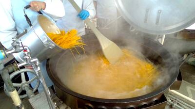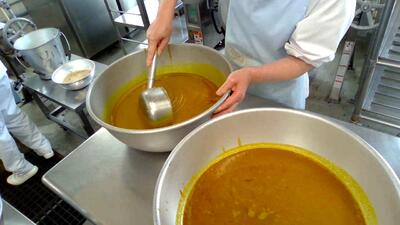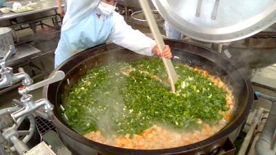 青ねぎスープは、東葛地方特産の青ねぎを16kg使用しました。釜の中に緑色の青ねぎを入れると、一気に彩り豊かになりました。