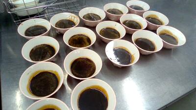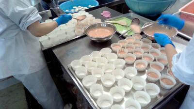 今日の米粉ケーキは、少量の米粉と水を熱して作る「湯種」を使って作りました。調理員さんによると、湯種を入れることで、米粉でもふんわり仕上がるそうです湯種は冷ましてから、卵や砂糖、油などの材料と合わせて生地を作りました。ブルーベリーは、流山市のブルーベリーガーデン池田さんのものを使用しました。粒が大きく立派なものでした。カップに注いでオーブンで焼くと、期待通りのふんわりした食感で、見た目もきれいに美味しく出来ました