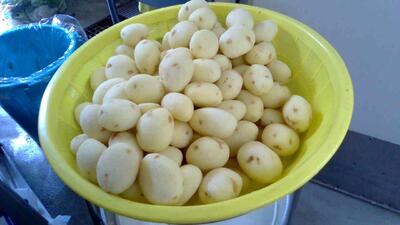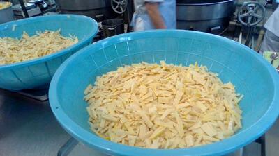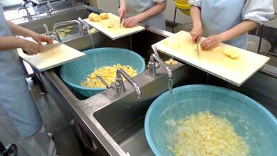 のり塩ポテトは、じゃがいもを素揚げして青のりと塩をまぶして作ります。調理員さんは美味しく作るために、前日に試作をし意見を出し合っていました。その結果、じゃがいもの美味しさが味わえる太めの切り方に落ち着きました。