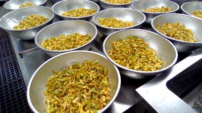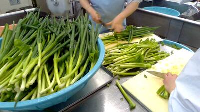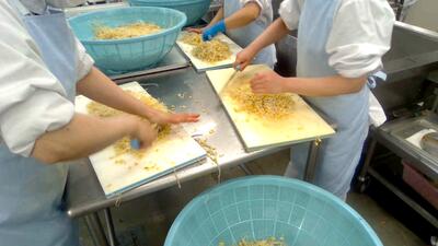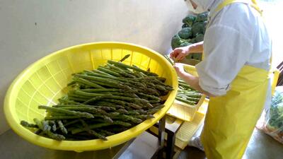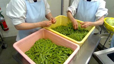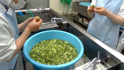 アスパラガスは根元が固いので、調理員さんが1つ1つポキポキと折りました。ブロッコリーは根元も食べられるので、皮をむいて、サイコロ状に切って使用しました。