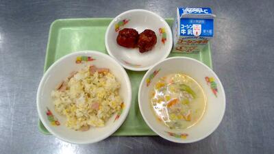 【献立】牛乳 チャーハン 肉団子の甘酢あん 鶏肉とキャベツの白湯スープ