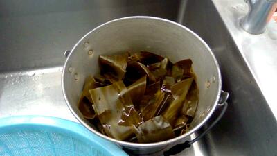 沢煮椀のだしを取った後の昆布を使って、つくだ煮を作りました。昆布は1×2cmほどに小さく切り、酒と梅を入れて煮ました。柔らかくなったところで調味料を加え、水分を飛ばして出来上がりです。梅の酸の力で柔らかく、みりんの照りでつややかに仕上がりました。