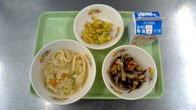 【献立】牛乳 白ごまタンタンうどん 角揚げと野菜の炒め煮 のり塩ポテト