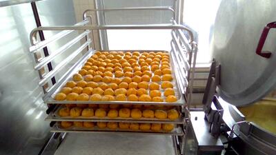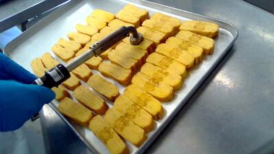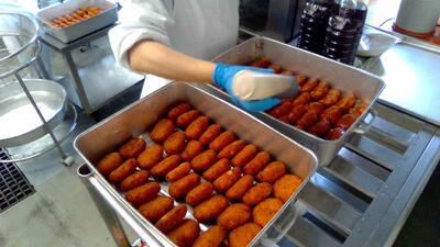 揚げパンの中でも、キャラメル揚げパンは特に人気がありますキャラメル味の粉末ミルメークとスキムミルクを合わせた粉の甘い香りがたまりません。担当調理員さんは、外側はカリッと、内側はふんわりした食感になるよう上手に揚げて下さいました。
