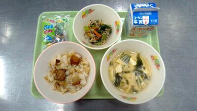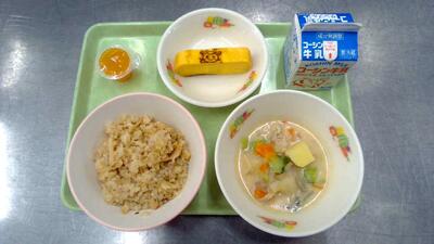 【献立】牛乳 たけのこご飯 厚焼き玉子 豆乳みそ汁