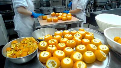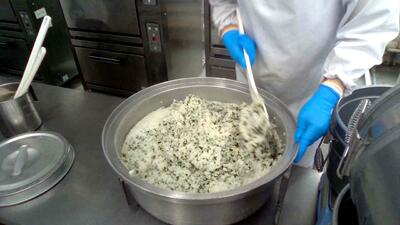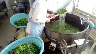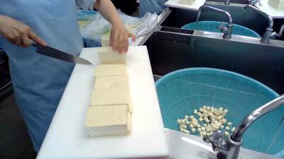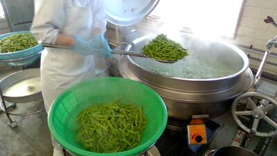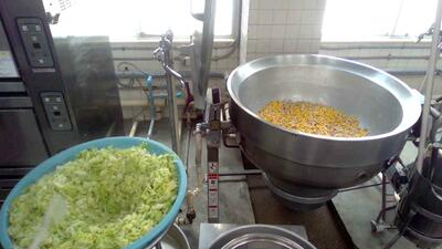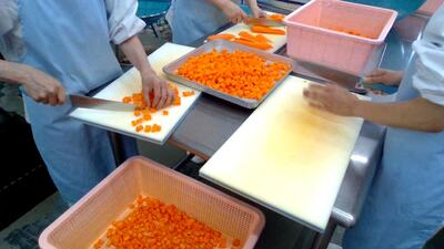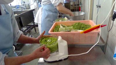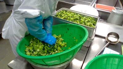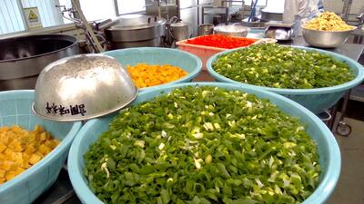 冷たいサラダは、夏場は作るのが難しい料理です。ゆでた野菜の温度がなかなか下がらないためです。ゆでたての野菜は流水にさらした後、冷蔵庫に入れるのですが、水道水の温度が30℃近くもあり野菜の温度が下がらないのです調理員さんは、野菜を早めにゆで、一部を冷凍庫に入れて冷やすことにしました。おかげで、ふだん通りの温度で仕上げることができました