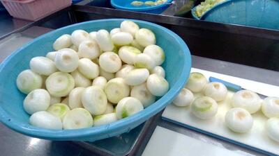 玉ねぎは、新玉ねぎが届きました。白と黄緑色で春を感じます。みそ汁に入れると、みずみずしさと甘さが感じられます。絹さやは一つ一つ調理員さんが筋を取り、半分に切りました。パリッとした食感で新鮮な絹さやでした。