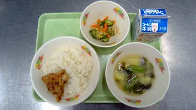 1年生もだんだん給食に慣れてきたようです。牛乳パックを1人で開けられる子が増えました。どのクラスも、おかわりの子が現れて一度は食缶が空になったのには驚きました。今日は全体によく食べられていました。