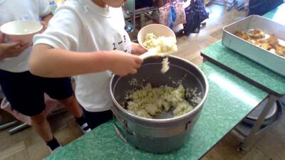 鶏肉のごまネーズ焼きは、本校で人気の一品です。マヨネーズとごま、香味野菜の香ばしい匂いで食欲をそそる味付けです。子ども達は、食缶に残ったたれまでスプーンで集めて食べていたそうです