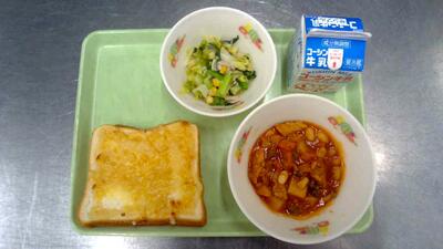 【献立】牛乳 キャラメル揚げパン 海藻サラダ ポークビーンズ
