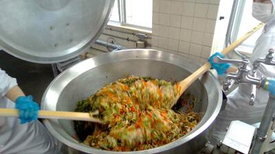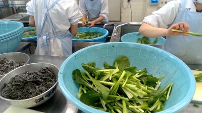 和え物の野菜は、ゆでて水冷してから、冷蔵庫に入れて冷やしました。よく絞って水気を取ったのですが、時間がたつともやしから水分が出ます。調理員さんが調味料を少しずつ加え、都度水分を取り除くことで、美味しい和え物に仕上がりました。