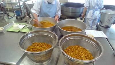 2学期の給食が始まりました。ドライカレーには、豚と鶏のひき肉やスパイスをたっぷり使います。鉄分補給のため、レバーも入って栄養満点です。子ども達からは「スパイシーで美味しい」と好評でした