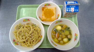 【献立】牛乳 スパゲティミートソース 春キャベツとベーコンのスープ 米粉のいちごケーキ