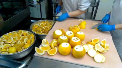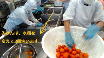 河内晩柑は、熊本県河内町で偶然発見された品種だそうです。見た目から、グレープフルーツだと思った子がたくさんいたので「グレープフルーツよりも苦みが少ないから食べてみてね」と声をかけました。1・2年生、なかよし、かがやき学級用は、食べやすいように外皮に切りこみを入れました。