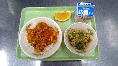 【献立】牛乳 手作りチキンカレー ツナとわかめのサラダ はちみつレモンゼリー
