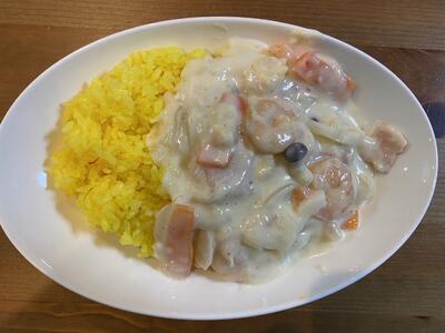 ご飯は、ターメリックとパプリカパウダーを混ぜて炊きました。魚貝類と鶏肉をトマトソースやチキンブイヨン等でよく煮込み、パプリカとピーマンを加えて具を作りました。黄色く炊けたご飯に具を混ぜて出来上がりです
