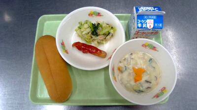 【献立】牛乳 黒糖パン オムレツ 温野菜のソテー アスパラと豆乳のクリームスープ