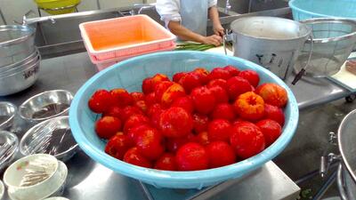 カレーには、トマト、なす、かぼちゃなど、夏野菜を使用しました。なすは素揚げし、かぼちゃは調理員さんの発案でスチームコンベクションオーブンで蒸しました。おかげで煮崩れず色良く仕上がりました
