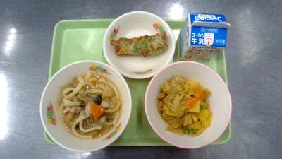 【献立】牛乳 ちゃんぽんうどん 浦上そぼろ フルーツ白玉