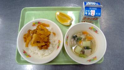 【献立】牛乳 スパイシータコス丼 ポテトスープ 河内晩柑
