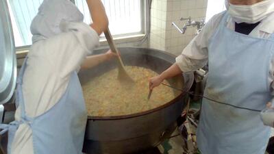 じゃがいもは、ゆでてつぶして、マッシュポテトにしておきました。にんじんはペースト状のものを使用し、コーンはクリームコーン缶を使いました。ベーコンと玉ねぎを炒めると、玉ねぎから水分が出ます。今日は、千葉県白子町の新玉ねぎだったので、特に水々しく甘みがありました。そこに、つぶした野菜を混ぜて調味し、豆乳を加えます。豆乳は70㍑使用しました。豆乳が凝固しないよう、混ぜながらゆっくり加熱していくと、とろみが出て美味しく仕上がりました。