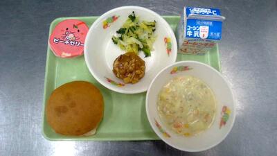 【献立】牛乳 照り焼きバーガー 豆乳コーンチャウダー ピーチゼリー