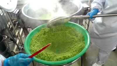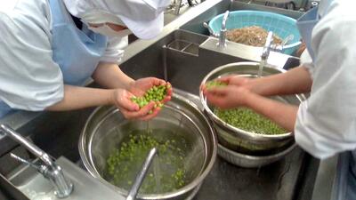 終了後、さっそく給食室に運んで、調理員さんに調理してもらいました。さやつき20kgから10kgの豆が取れました。3回洗って、フードプロセッサで粗く刻み、さっとゆでました。塩味を付けたご飯に混ぜて、ごまを振って出来上がりです!