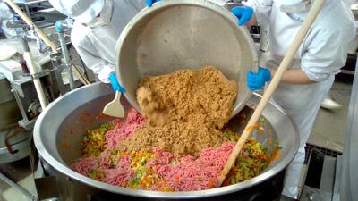 肉団子は、豚ひき肉46kg、木綿豆腐15kg、玉ねぎ10kg、調味料を練って作りました。調理員さんは1180人分×2個で、2360個も丸めて下さいました。揚げる際はクッキングシートごと揚げ油に入れ、表面が固まった頃合いを見て、シートを引き上げます。1回200個ずつ揚げて、2時間半かかりました。初登場の料理でしたが、予定時間通りにスムーズに仕上がりました。表面はカリッと、内側はふんわり仕上がりました。ケチャップと酢などを合わせて作ったあんにからめて、出来上がりです。