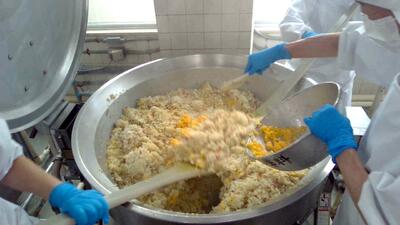 今年度は、給食室に2人の新しい調理員さんを迎えたのですが、今日は2人の調理デビューの日でした。大きなスパテラで釜の中をまんべんなく混ぜるのは、コツが入ります。先輩調理員さんに教わりながら、2人は緊張の面持ちで作業していました。