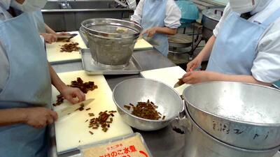 沢煮椀のだしを取った後の昆布を使って、つくだ煮を作りました。昆布は1×2cmほどに小さく切り、酒と梅を入れて煮ました。柔らかくなったところで調味料を加え、水分を飛ばして出来上がりです。梅の酸の力で柔らかく、みりんの照りでつややかに仕上がりました。