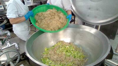 和え物の野菜は、ゆでて水冷してから、冷蔵庫に入れて冷やしました。よく絞って水気を取ったのですが、時間がたつともやしから水分が出ます。調理員さんが調味料を少しずつ加え、都度水分を取り除くことで、美味しい和え物に仕上がりました。
