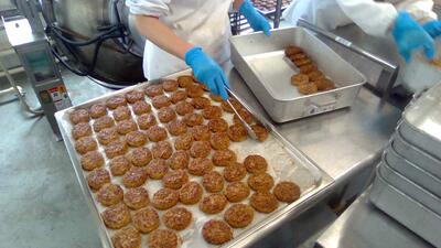 肉団子は、豚ひき肉46kg、木綿豆腐15kg、玉ねぎ10kg、調味料を練って作りました。調理員さんは1180人分×2個で、2360個も丸めて下さいました。揚げる際はクッキングシートごと揚げ油に入れ、表面が固まった頃合いを見て、シートを引き上げます。1回200個ずつ揚げて、2時間半かかりました。初登場の料理でしたが、予定時間通りにスムーズに仕上がりました。表面はカリッと、内側はふんわり仕上がりました。ケチャップと酢などを合わせて作ったあんにからめて、出来上がりです。