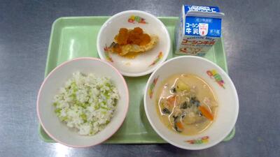 2年生教室では、「グリンピースご飯、美味しいよ!」と言ってくれる子、「苦手だから減らす…」という子等、反応も様々です。苦手な子に、冷凍品と生の違いを説明してみると「これは中が固いから、ちょっとは食べられるかも」と言ってくれました。「苦手だけど、頑張って食べたよ!」と報告してくれる子もいました。おかわりする子も多く見られ、全体によく食べられていました。楽しい記憶として残ってくれたらよいなと思います。